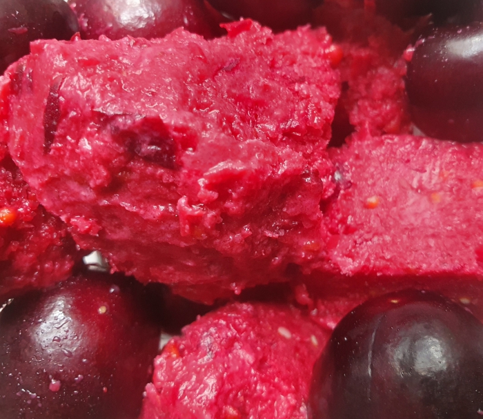 Eis kann auch kalorienarm, zuckerfrei und vegan sein, wie zB hier das Johannisbeer-Kirscheis mit Mandelmus