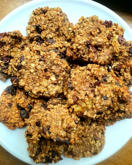 Haferflocken-Cranberry-Banane-Schoko-Cookies mit Mandelmus und Chiasamen. Vegan, gluten- und haushaltszuckerfrei.