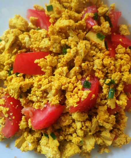 Frühstückstipp: Rührtofu mit Tomaten, Schnittlauch und Kurkuma ist eiweiß- und eisenreich, sowie fettarm.