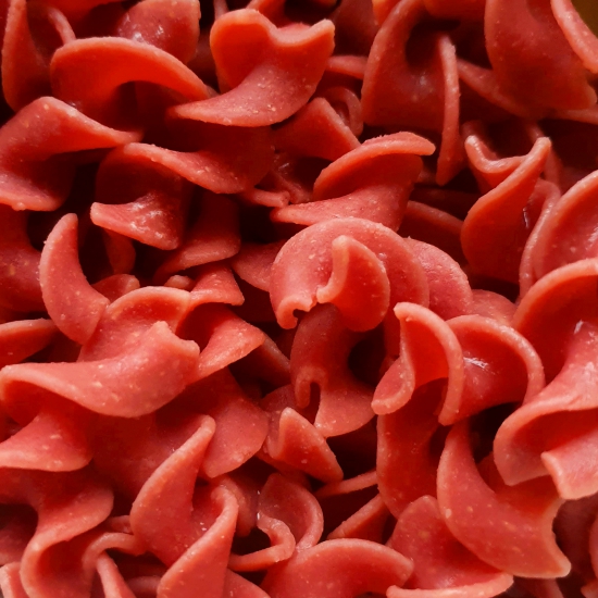 Nudeln aus Kichererbsenmehl und rote Beete Pulver. Vegan und glutenfrei. Sie sind mit doppelt so viel Eiweiß wie herkömmliche Nudeln und langkettigen Kohlenhydraten - die sättigen, die Verdauung ankurbeln und den Blutzuckerspiegel konstant halten - ideal für Sportler.